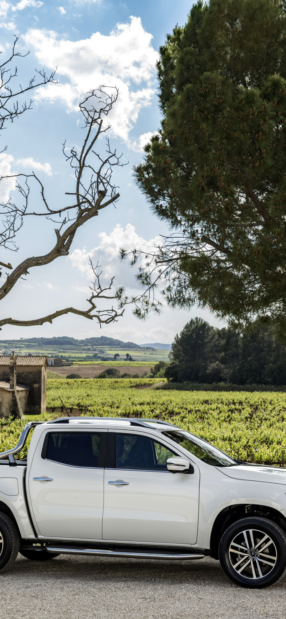 Назад к обои поле, белый, деревья, растительность, Mercedes-Benz, дома, стоянка, пикап