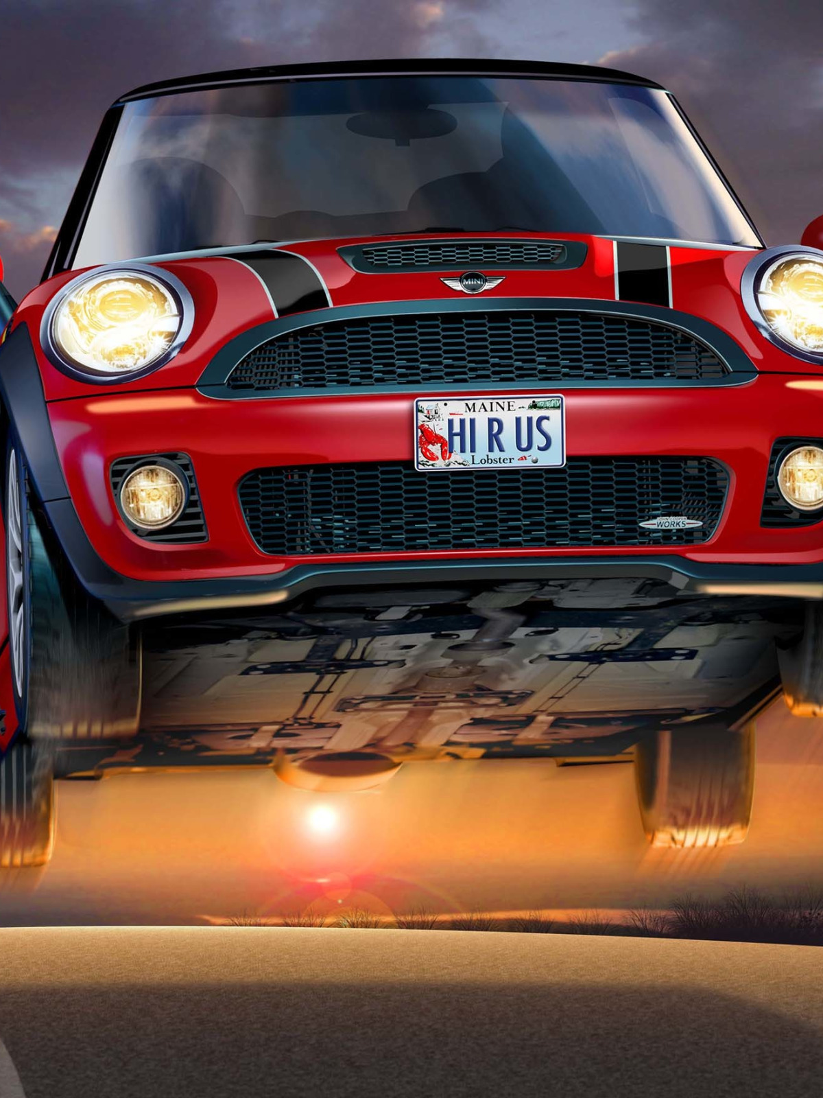 Назад к обои дорога, небо, закат, красный, фары, рисунок, Mini, Mini Cooper